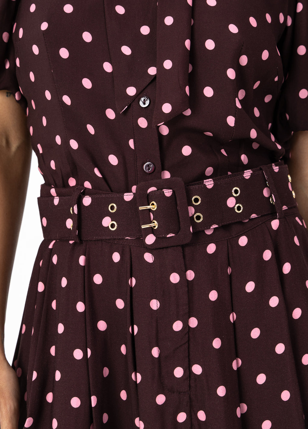 Modellen er 176 cm høj og bruger størrelse S. Hun måler 82 cm omkring brystet, 69 cm omkring taljen og 92 cm omkring hofterne.