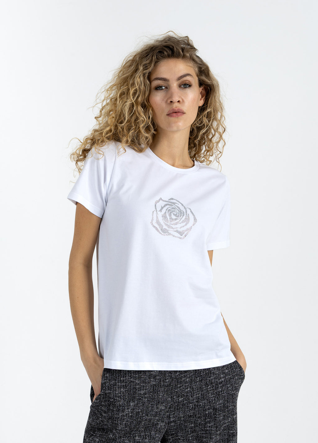 Modellen er 182 cm høj og bruger størrelse S. Hendes bryst måler 82 cm, talje 61 cm og hofter 93 cm.