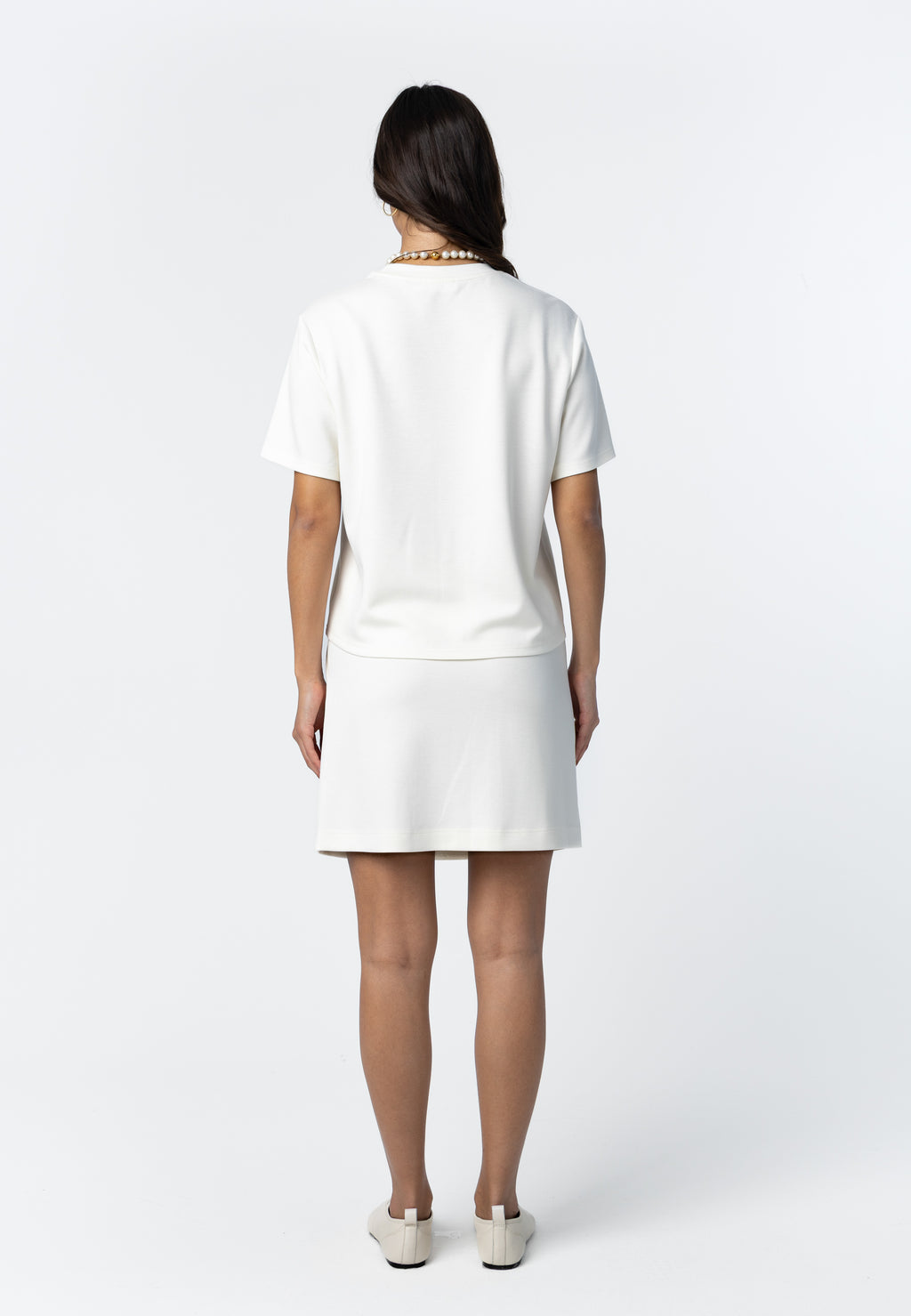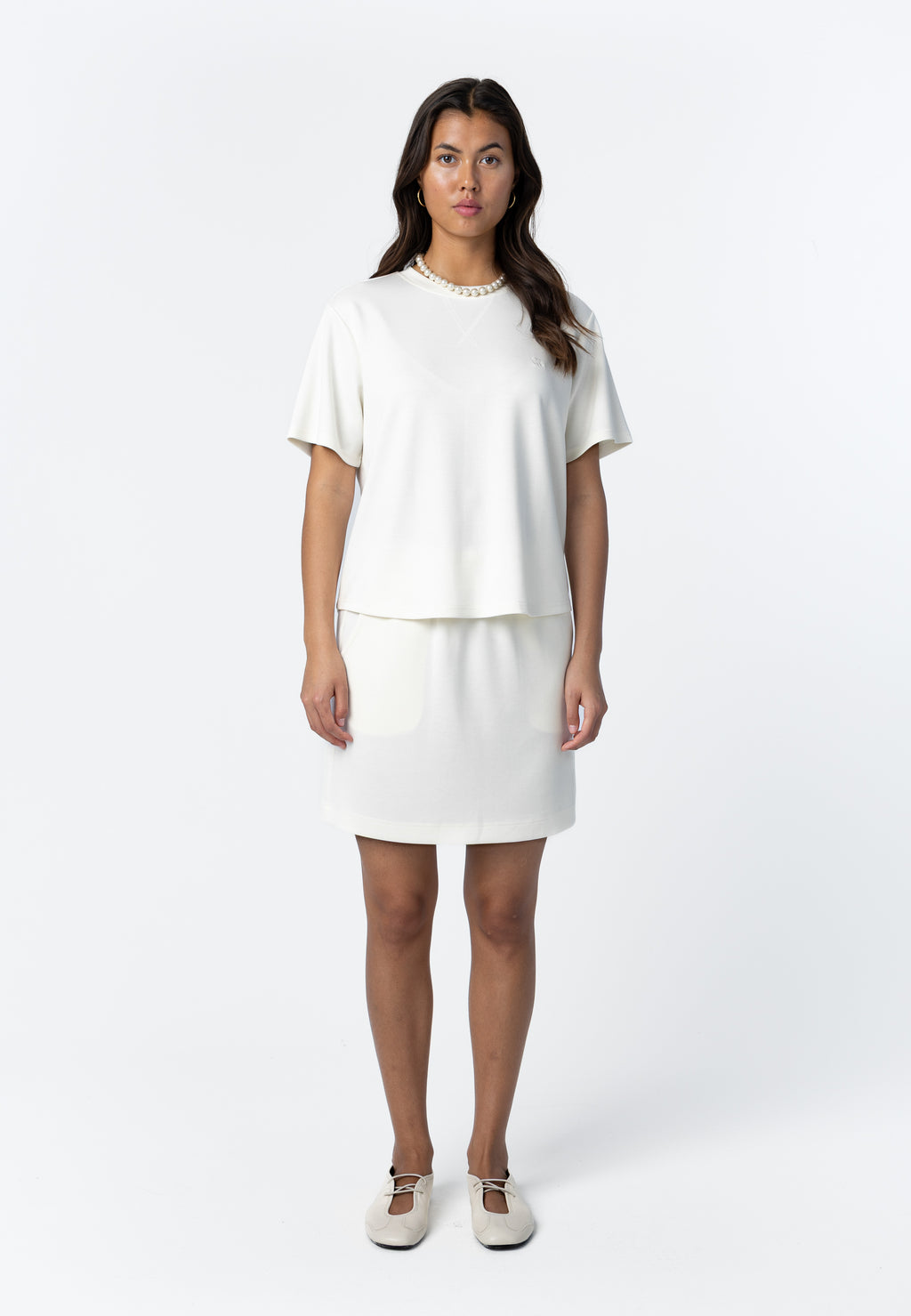 Modellen er 173 cm høj og bruger størrelse S. Hun måler 84 cm omkring brystet, 65 cm omkring taljen og 96 cm omkring hofterne.