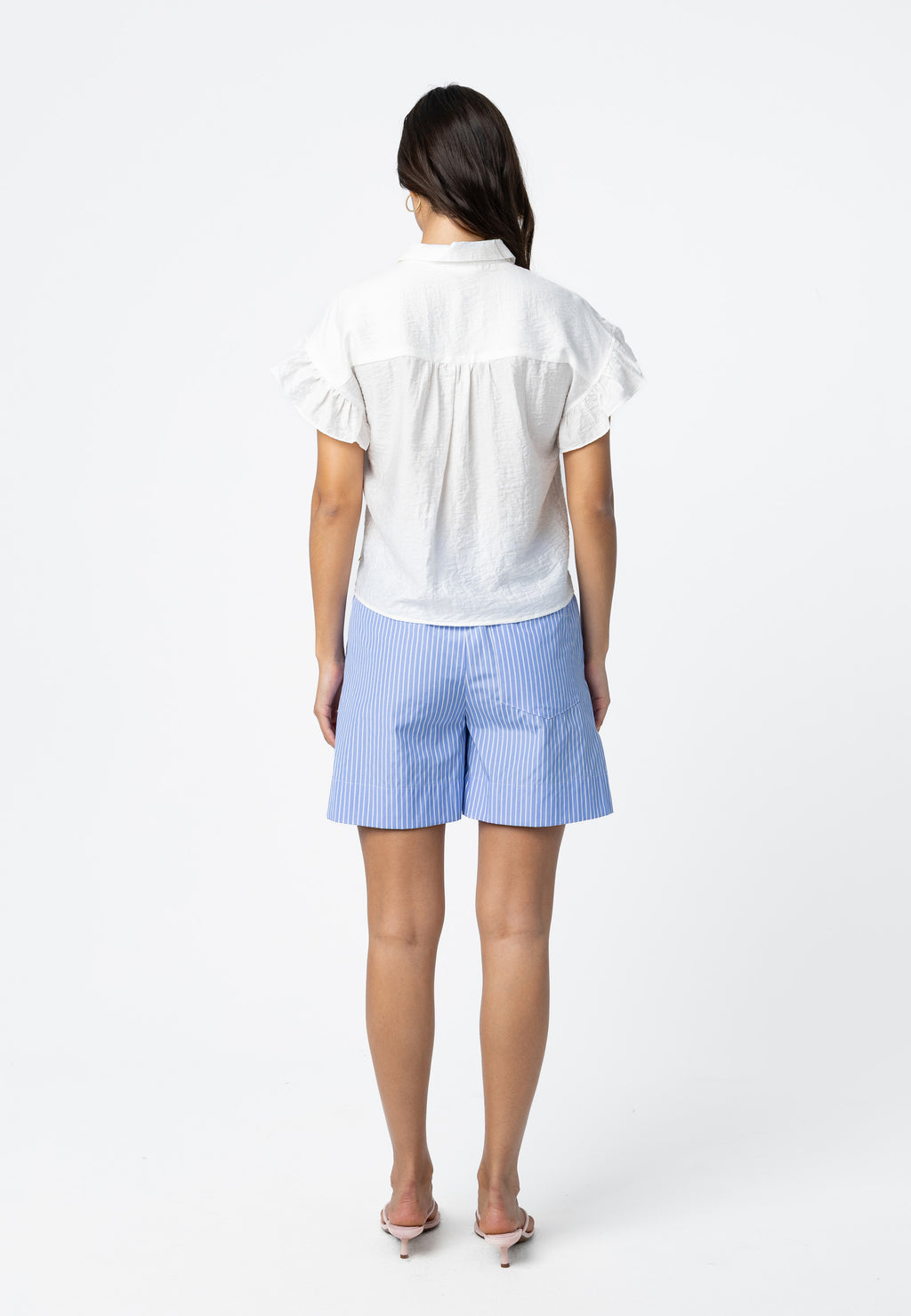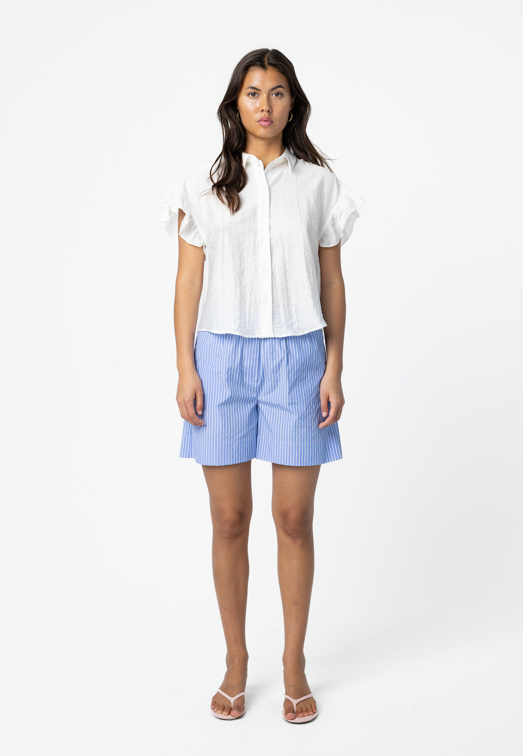Modellen er 173 cm høj og bruger størrelse S. Hun måler 84 cm omkring brystet, 65 cm omkring taljen og 96 cm omkring hofterne.
