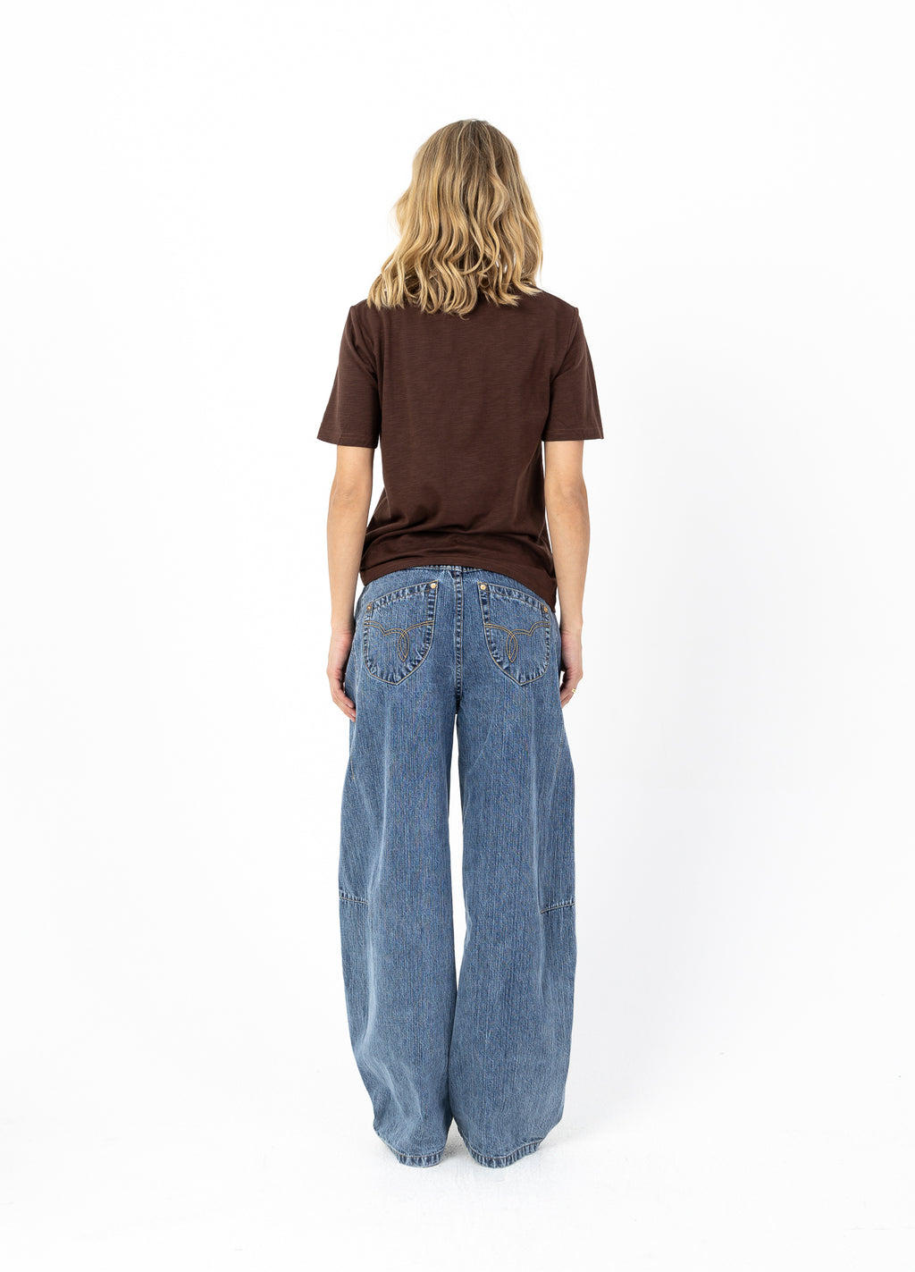 Modellen er 173 cm høj og bærer størrelse S. Hun måler 84 cm om brystet, 65 cm om taljen og 96 cm om hofterne.