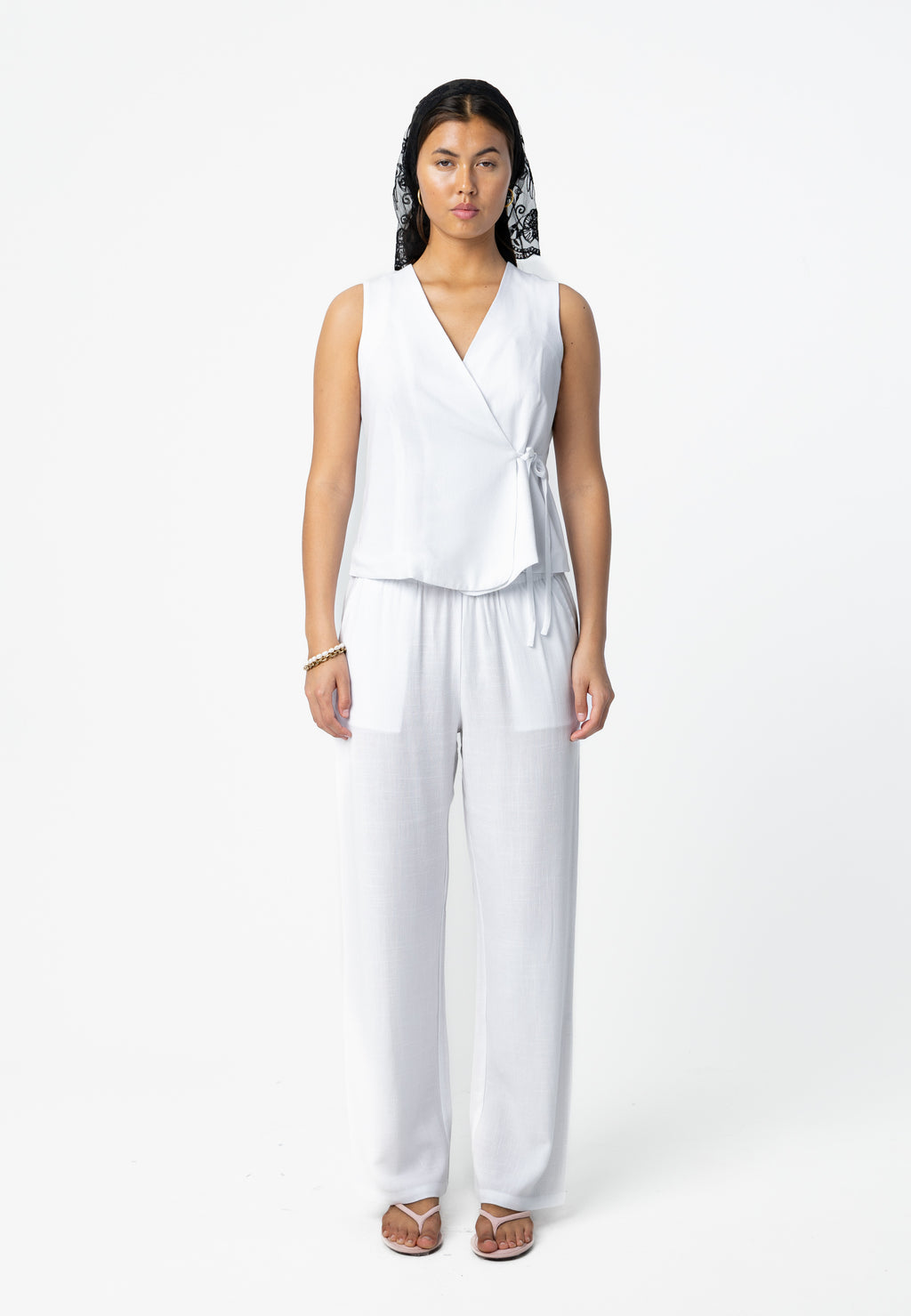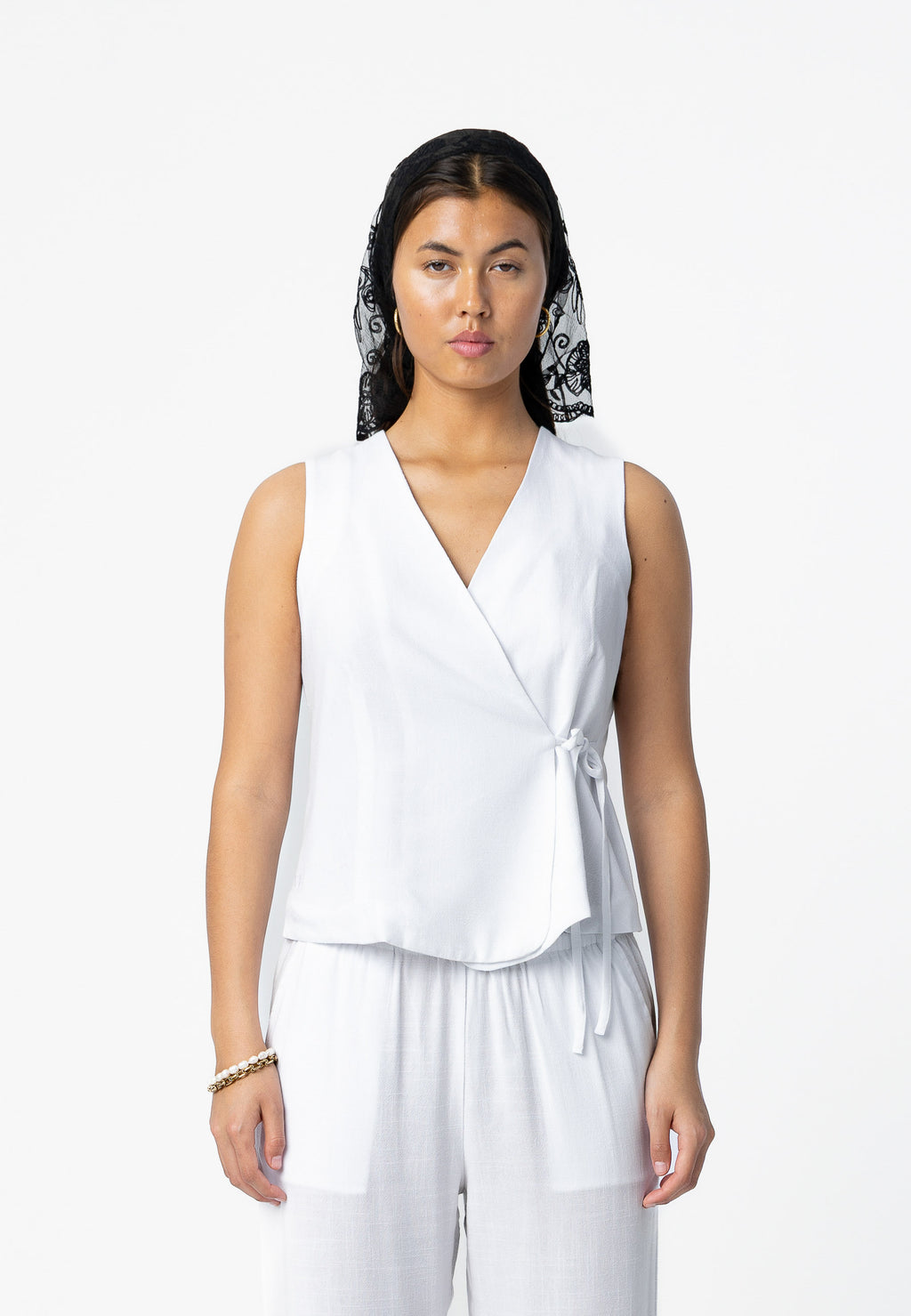 Modellen er 173 cm høj og bruger størrelse S. Hun måler 84 cm omkring brystet, 65 cm omkring taljen og 96 cm omkring hofterne.