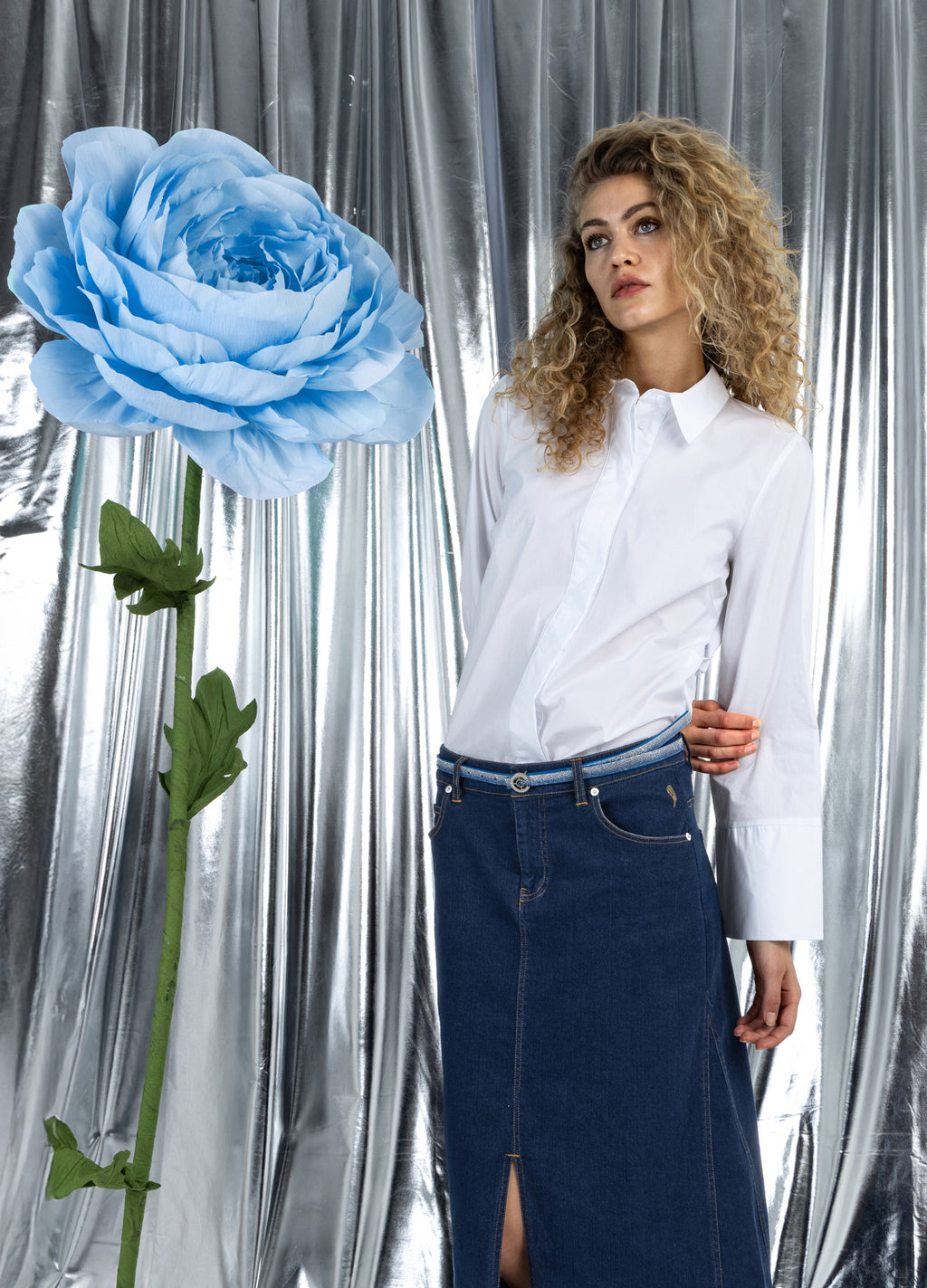 Modellen er 182 cm høj og bruger størrelse S. Hendes brystmål er 82 cm, talje 61 cm og hofter 93 cm.